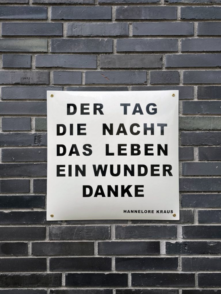 Schlichte Worte auf einer Emaile-Tafel. Keine Erklärung. Nur ein Blick auf das Ganze: auf den Tag, die Nacht, das Leben – als Wunder. Und ein Dank.
